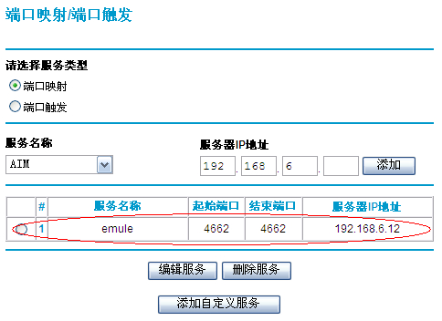 3、以eMule为例。当在局域网中使用eMule时,通常只能获得LowID,通过端口映射后即可获得HighID了。在“服务名称”中添加您为此服务的命名,此处我们将其命名为eMule,“服务类型”选择TCP(或者TCP/UDP):